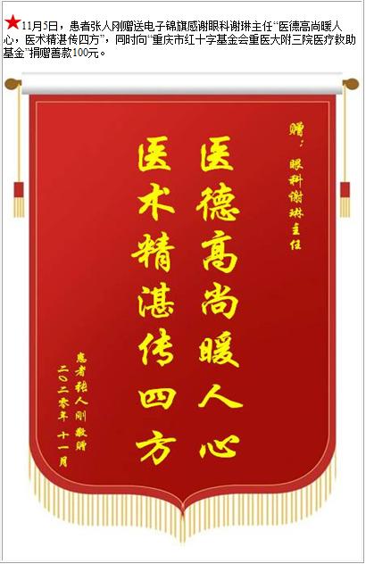 患者张人刚赠送电子锦旗感谢眼科谢琳主任,并向医疗救助基金捐赠善款100元-锦旗-患者心声-患者服务-重庆医科大学附属第三医院【官方网站】