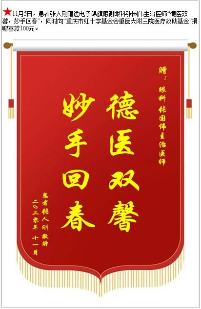 患者张人刚赠送电子锦旗感谢眼科张国伟主治医师,并向医疗救助基金捐赠善款100元-锦旗-患者心声-患者服务-重庆医科大学附属第三医院【官方网站】