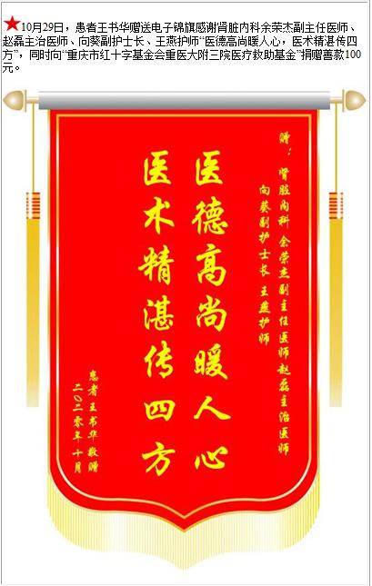 患者王书华赠送电子锦旗感谢肾脏内科余荣杰副主任医师等人,并向医疗救助基金捐赠善款100元-锦旗-患者心声-患者服务-重庆医科大学附属第三医院【官方网站】