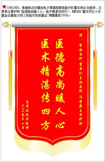 患者陈远庆赠送电子锦旗感谢肾脏内科霍本刚主治医师等人,并向医疗救助基金捐赠善款100元-锦旗-患者心声-患者服务-重庆医科大学附属第三医院【官方网站】