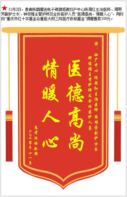 患者陈璐赠送电子锦旗感谢妇产中心陈周红主治医师等人及全体医护人员,并向医疗救助基金捐赠善款100元-锦旗-患者心声-患者服务-重庆医科大学附属第三医院【官方网站】