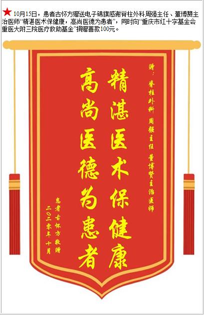 患者古怀方赠送电子锦旗感谢脊柱外科周强主任等人,并向医疗救助基金捐赠善款100元-锦旗-患者心声-患者服务-重庆医科大学附属第三医院【官方网站】
