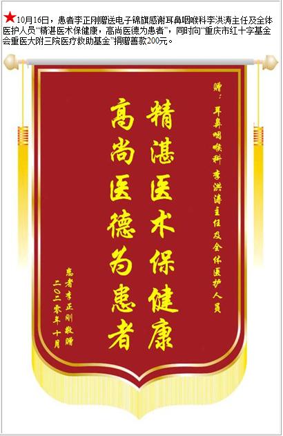 患者李正刚赠送电子锦旗感谢耳鼻咽喉科李洪涛主任及全体医护人员,并向医疗救助基金捐赠善款200元-锦旗-患者心声-患者服务-重庆医科大学附属第三医院【官方网站】