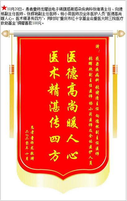患者童师龙赠送电子锦旗感谢感染疾病科张绪清主任等人及全体医护人员,并向医疗救助基金捐赠善款100元-锦旗-患者心声-患者服务-重庆医科大学附属第三医院【官方网站】