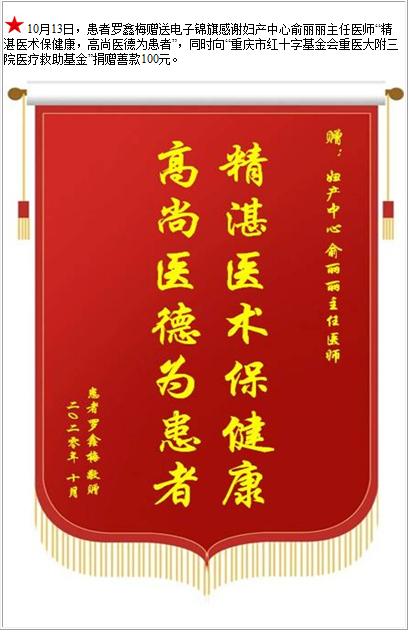 患者罗鑫梅赠送电子锦旗感谢妇产中心俞丽丽主任医师,并向医疗救助基金捐赠善款100元-锦旗-患者心声-患者服务-重庆医科大学附属第三医院【官方网站】