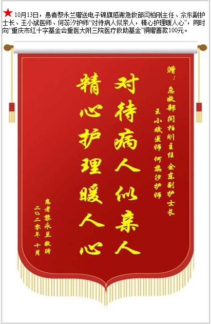 患者黎永兰赠送电子锦旗感谢急救部闫柏刚主任等人,并向医疗救助基金捐赠善款100元-锦旗-患者心声-患者服务-重庆医科大学附属第三医院【官方网站】