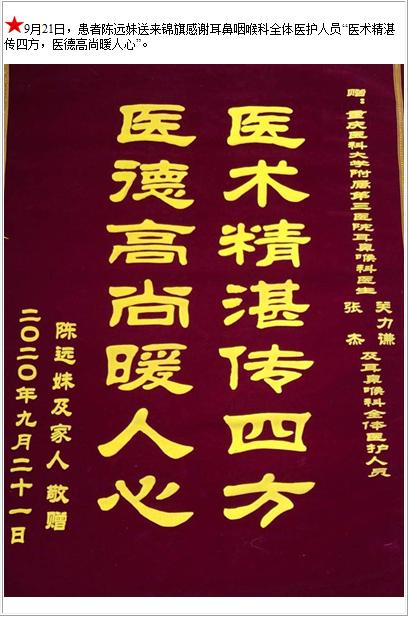 患者陈远妹送来锦旗感谢耳鼻咽喉科全体医护人员“医术精湛传四方,医德高尚暖人心”-锦旗-患者心声-患者服务-重庆医科大学附属第三医院【官方网站】