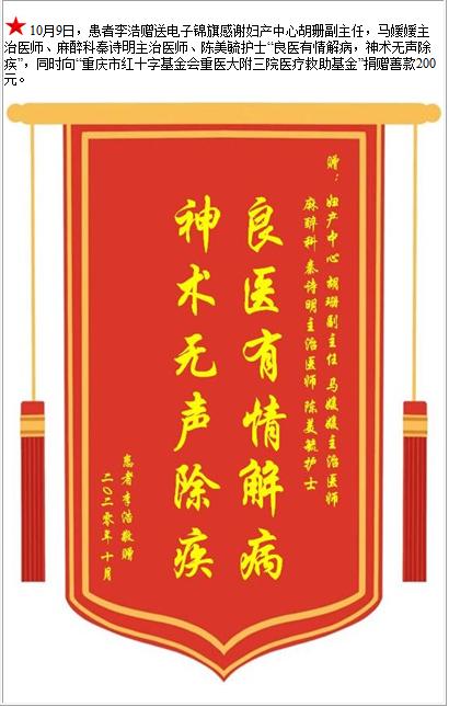 患者李浩赠送电子锦旗感谢妇产中心胡珊副主任、麻醉科秦诗明主治医师等人,并向医疗救助基金捐赠善款200元-锦旗-患者心声-患者服务-重庆医科大学附属第三医院【官方网站】