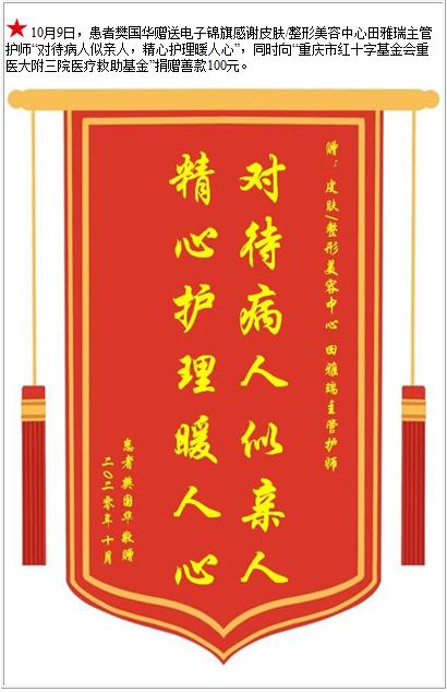 患者樊国华赠送电子锦旗感谢皮肤/整形美容中心田雅瑞主管护师,并向医疗救助基金捐赠善款100元-锦旗-患者心声-患者服务-重庆医科大学附属第三医院【官方网站】