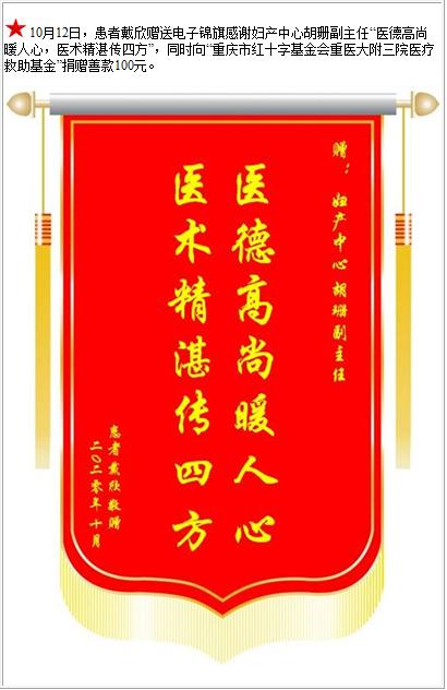 患者戴欣赠送电子锦旗感谢妇产中心胡珊副主任,并向医疗救助基金捐赠善款100元-锦旗-患者心声-患者服务-重庆医科大学附属第三医院【官方网站】