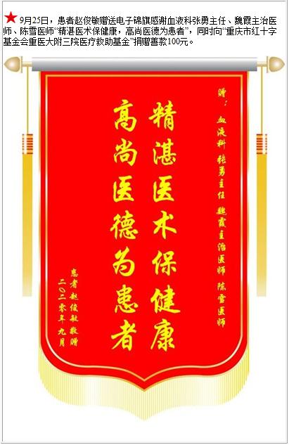 患者赵俊敏赠送电子锦旗感谢血液科张勇主任等人,并向医疗救助基金捐赠善款100元-锦旗-患者心声-患者服务-重庆医科大学附属第三医院【官方网站】