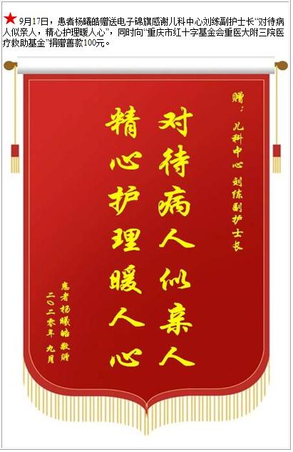 患者杨曦皓赠送电子锦旗感谢儿科中心刘练副护士长,并向医疗救助基金捐赠善款100元-锦旗-患者心声-患者服务-重庆医科大学附属第三医院【官方网站】