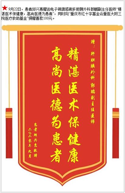 患者邱兴惠赠送电子锦旗感谢肝胆胰外科郭鹏副主任医师,并向医疗救助基金捐赠善款100元-锦旗-患者心声-患者服务-重庆医科大学附属第三医院【官方网站】