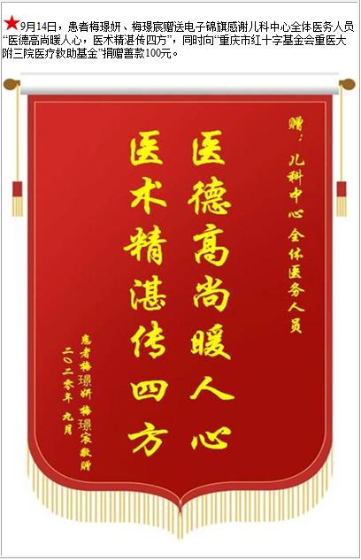 患者梅璟妍、梅璟宸赠送电子锦旗感谢儿科中心全体医务人员,并向医疗救助基金捐赠善款100元-锦旗-患者心声-患者服务-重庆医科大学附属第三医院【官方网站】