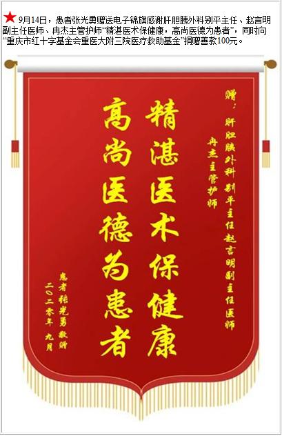 患者张光勇赠送电子锦旗感谢肝胆胰外科别平主任等人,并向医疗救助基金捐赠善款100元-锦旗-患者心声-患者服务-重庆医科大学附属第三医院【官方网站】