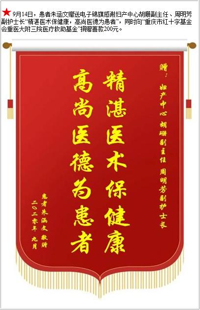 患者朱涵文赠送电子锦旗感谢妇产中心胡珊副主任等人,并向医疗救助基金捐赠善款200元-锦旗-患者心声-患者服务-重庆医科大学附属第三医院【官方网站】