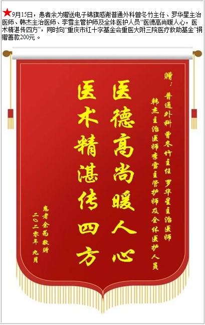 患者余为赠送电子锦旗感谢普通外科曾冬竹主任等人及全体医护人员,并向医疗救助基金捐赠善款200元-锦旗-患者心声-患者服务-重庆医科大学附属第三医院【官方网站】