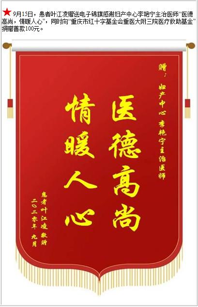 患者叶江凌赠送电子锦旗感谢妇产中心李艳宁主治医师,并向医疗救助基金捐赠善款100元-锦旗-患者心声-患者服务-重庆医科大学附属第三医院【官方网站】