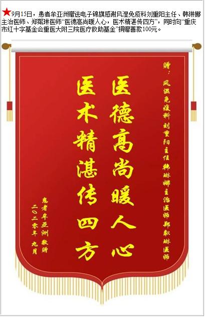 患者牟亚洲赠送电子锦旗感谢风湿免疫科刘重阳主任等人,并向医疗救助基金捐赠善款100元-锦旗-患者心声-患者服务-重庆医科大学附属第三医院【官方网站】