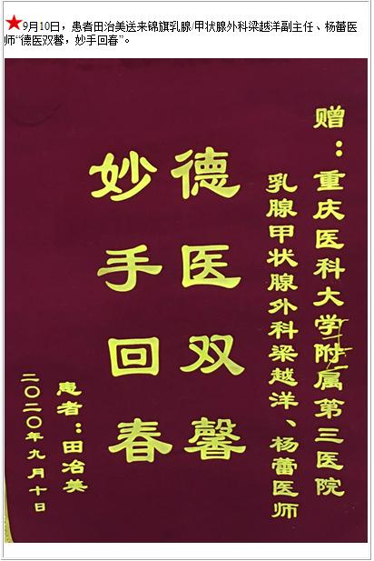 患者田治美送来锦旗乳腺/甲状腺外科梁越洋副主任、杨蕾医师“德医双馨,妙手回春”-锦旗-患者心声-患者服务-重庆医科大学附属第三医院【官方网站】