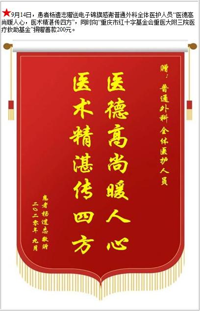 患者杨遗志赠送电子锦旗感谢普通外科全体医护人员,并向医疗救助基金捐赠善款200元-锦旗-患者心声-患者服务-重庆医科大学附属第三医院【官方网站】