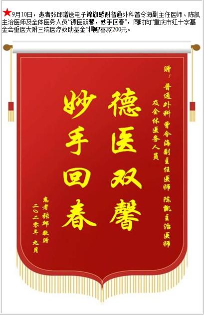 患者张邱赠送电子锦旗感谢普通外科曾令海副主任医师等人及全体医务人员,并向医疗救助基金捐赠善款200元-锦旗-患者心声-患者服务-重庆医科大学附属第三医院【官方网站】
