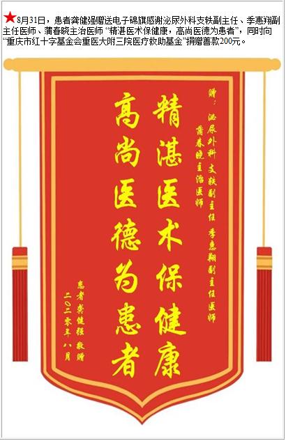 患者龚健强赠送电子锦旗感谢泌尿外科支轶副主任等人,并向医疗救助基金捐赠善款200元-锦旗-患者心声-患者服务-重庆医科大学附属第三医院【官方网站】