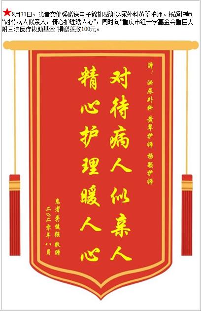 患者龚健强赠送电子锦旗感谢泌尿外科黄翠护师等人,并向医疗救助基金捐赠善款100元-锦旗-患者心声-患者服务-重庆医科大学附属第三医院【官方网站】