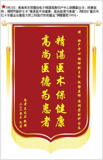 患者吴友莉赠送电子锦旗感谢妇产中心胡珊副主任等人,并向医疗救助基金捐赠善款100元-锦旗-患者心声-患者服务-重庆医科大学附属第三医院【官方网站】