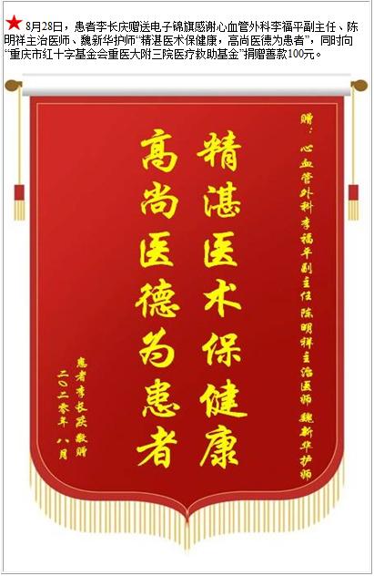 患者李长庆赠送电子锦旗感谢心血管外科李福平副主任等人,并向医疗救助基金捐赠善款100元-锦旗-患者心声-患者服务-重庆医科大学附属第三医院【官方网站】