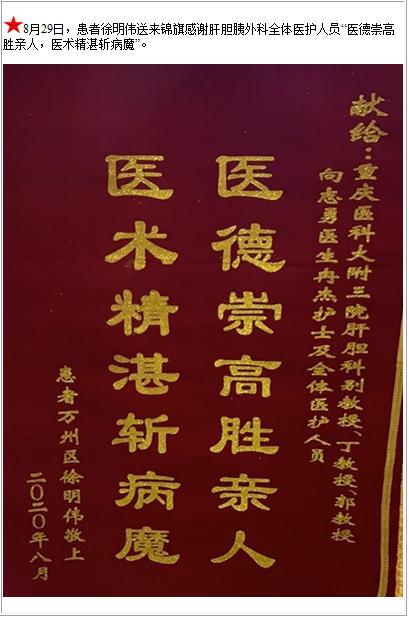 患者徐明伟送来锦旗感谢肝胆胰外科全体医护人员“医德崇高胜亲人,医术精湛斩病魔”-锦旗-患者心声-患者服务-重庆医科大学附属第三医院【官方网站】