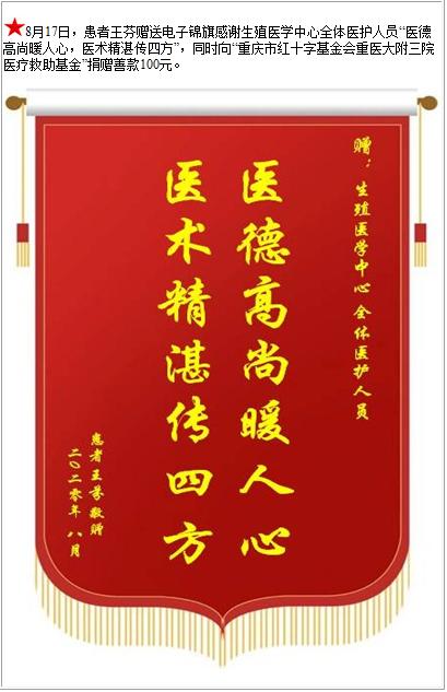患者王芬赠送电子锦旗感谢生殖医学中心全体医护人员,并向医疗救助基金捐赠善款100元-锦旗-患者心声-患者服务-重庆医科大学附属第三医院【官方网站】