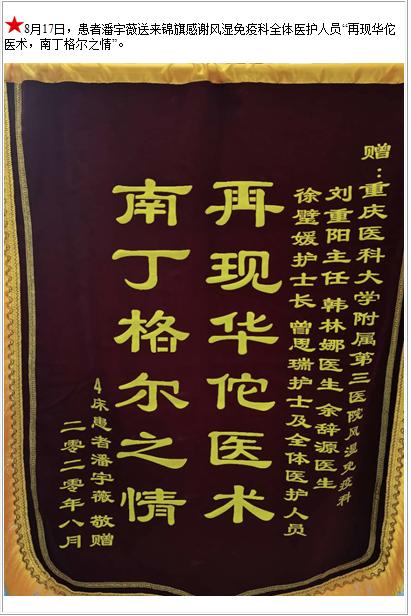 患者潘宇薇送来锦旗感谢风湿免疫科全体医护人员“再现华佗医术,南丁格尔之情”-锦旗-患者心声-患者服务-重庆医科大学附属第三医院【官方网站】