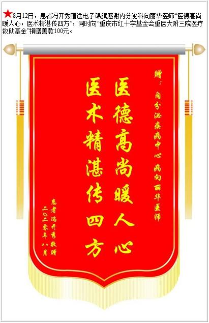 患者冯开秀赠送电子锦旗感谢内分泌科向丽华医师,并向医疗救助基金捐赠善款100元-锦旗-患者心声-患者服务-重庆医科大学附属第三医院【官方网站】