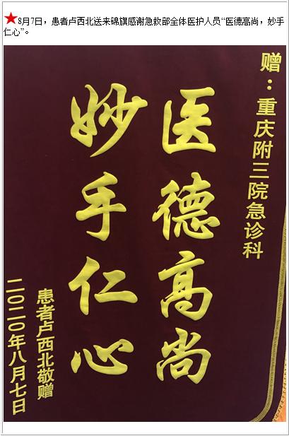 患者卢西北送来锦旗感谢急救部全体医护人员“医德高尚,妙手仁心”-锦旗-患者心声-患者服务-重庆医科大学附属第三医院【官方网站】