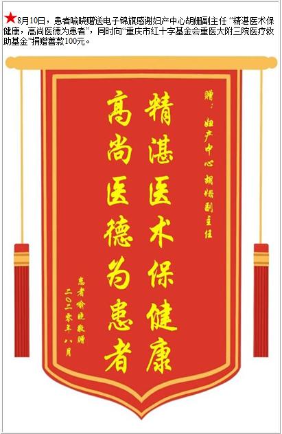 患者喻晓赠送电子锦旗感谢妇产中心胡姗副主任,并向医疗救助基金捐赠善款100元-锦旗-患者心声-患者服务-重庆医科大学附属第三医院【官方网站】