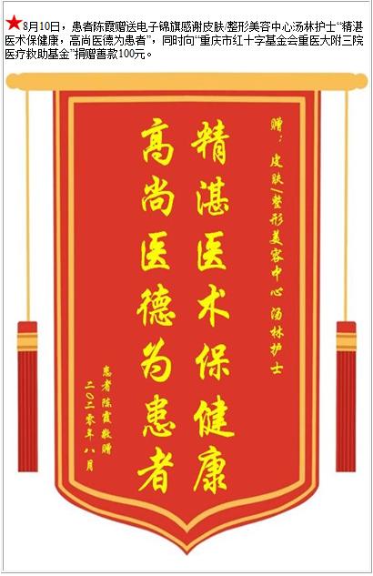 患者陈霞赠送电子锦旗感谢皮肤/整形美容中心汤林护士,并向医疗救助基金捐赠善款100元-锦旗-患者心声-患者服务-重庆医科大学附属第三医院【官方网站】