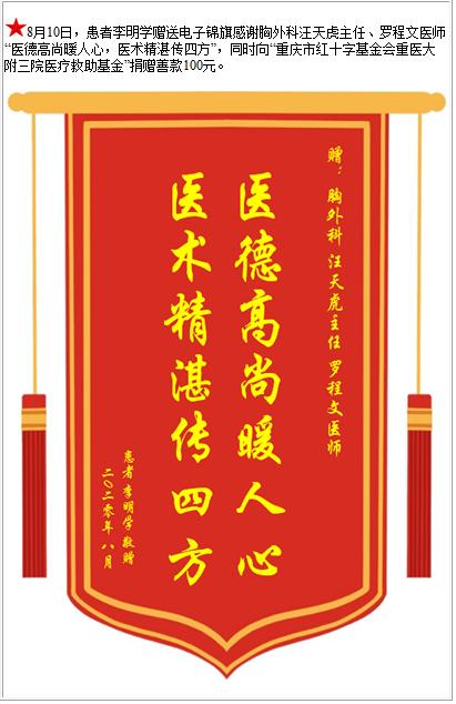 患者李明学赠送电子锦旗感谢胸外科汪天虎主任等人,并向医疗救助基金捐赠善款100元-锦旗-患者心声-患者服务-重庆医科大学附属第三医院【官方网站】
