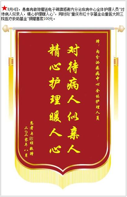 患者冉啟琼赠送电子锦旗感谢内分泌疾病中心全体护理人员,并向医疗救助基金捐赠善款100元-锦旗-患者心声-患者服务-重庆医科大学附属第三医院【官方网站】