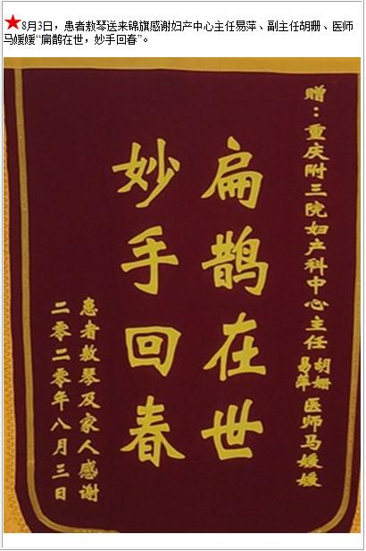 患者敖琴送来锦旗感谢妇产中心主任易萍、副主任胡珊、医师马媛媛“扁鹊在世,妙手回春”-锦旗-患者心声-患者服务-重庆医科大学附属第三医院【官方网站】