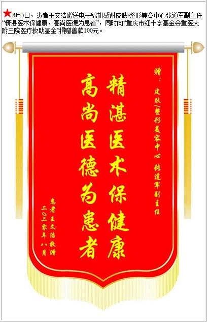 患者王文浩赠送电子锦旗感谢皮肤/整形美容中心张道军副主任,并向医疗救助基金捐赠善款100元-锦旗-患者心声-患者服务-重庆医科大学附属第三医院【官方网站】