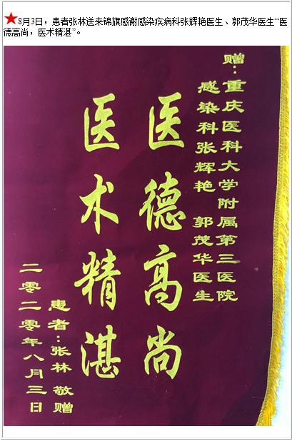 患者张林送来锦旗感谢感染疾病科张辉艳医生、郭茂华医生“医德高尚,医术精湛”-锦旗-患者心声-患者服务-重庆医科大学附属第三医院【官方网站】