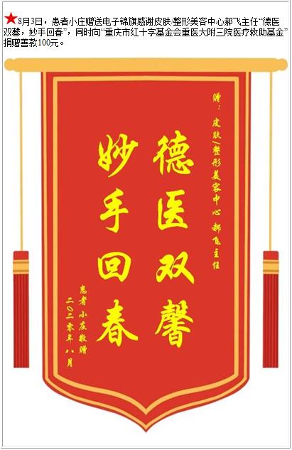 患者小庄赠送电子锦旗感谢皮肤/整形美容中心郝飞主任,并向医疗救助基金捐赠善款100元-锦旗-患者心声-患者服务-重庆医科大学附属第三医院【官方网站】