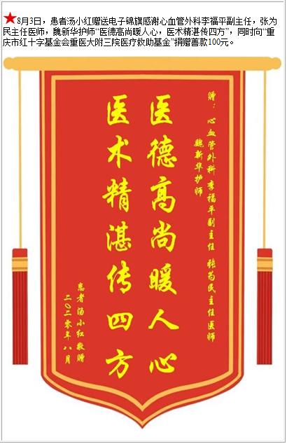 患者汤小红赠送电子锦旗感谢心血管外科李福平副主任等人,并向医疗救助基金捐赠善款100元-锦旗-患者心声-患者服务-重庆医科大学附属第三医院【官方网站】