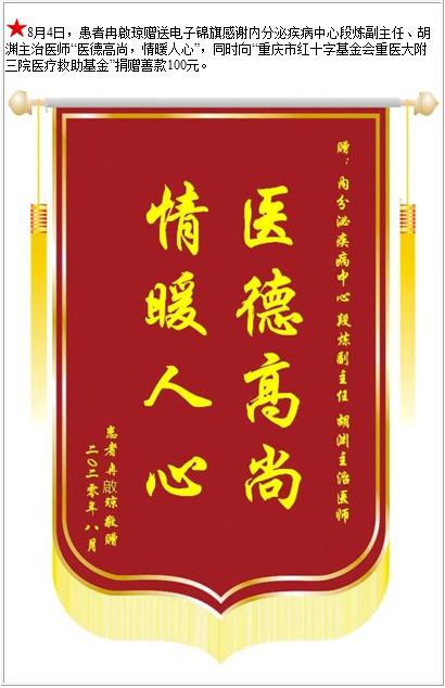 患者冉啟琼赠送电子锦旗感谢内分泌疾病中心段炼副主任等人,并向医疗救助基金捐赠善款100元-锦旗-患者心声-患者服务-重庆医科大学附属第三医院【官方网站】