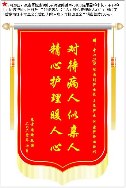 患者周斌赠送电子锦旗感谢中心ICU陈雨副护士长等人,并向医疗救助基金捐赠善款100元-锦旗-患者心声-患者服务-重庆医科大学附属第三医院【官方网站】