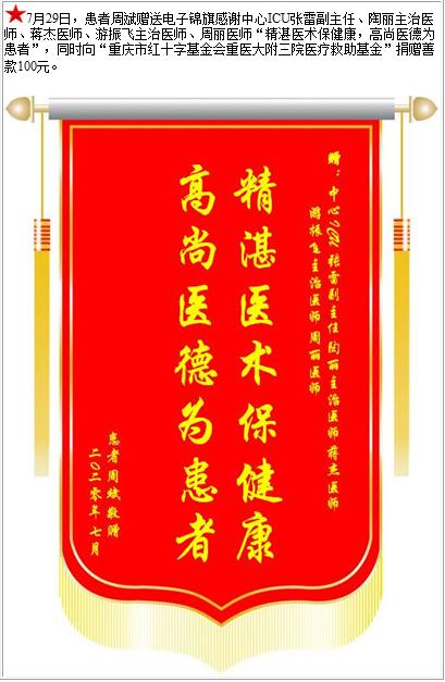 患者周斌赠送电子锦旗感谢中心ICU张雷副主任等人,并向医疗救助基金捐赠善款100元。-锦旗-患者心声-患者服务-重庆医科大学附属第三医院【官方网站】