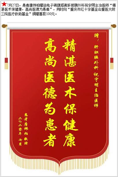 患者唐炜柏赠送电子锦旗感谢肝胆胰外科祝宇明主治医师,并向医疗救助基金捐赠善款100元-锦旗-患者心声-患者服务-重庆医科大学附属第三医院【官方网站】