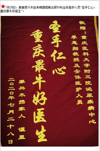 患者廖兴木送来锦旗感谢泌尿外科全体医护人员“圣手仁心,重庆最牛好医生”-锦旗-患者心声-患者服务-重庆医科大学附属第三医院【官方网站】