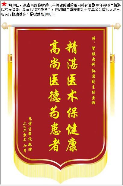 患者肖帮俊赠送电子锦旗感谢肾脏内科孙岩副主任医师,并向医疗救助基金捐赠善款100元-锦旗-患者心声-患者服务-重庆医科大学附属第三医院【官方网站】